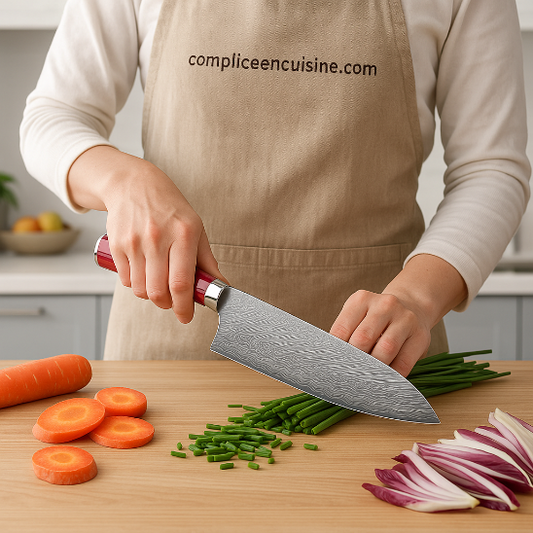 Le manche joue aussi un rĂŽle crucial dans le confort d'utilisation. Il doit offrir une prise en main sĂ»re et confortable, mĂȘme avec les mains humides. Nos couteaux comme le Shin'Essentiel disposent de manches ergonomiques qui s'adaptent naturellement Ă votre main pour rĂ©duire la fatigue lors des longues sessions de prĂ©paration.