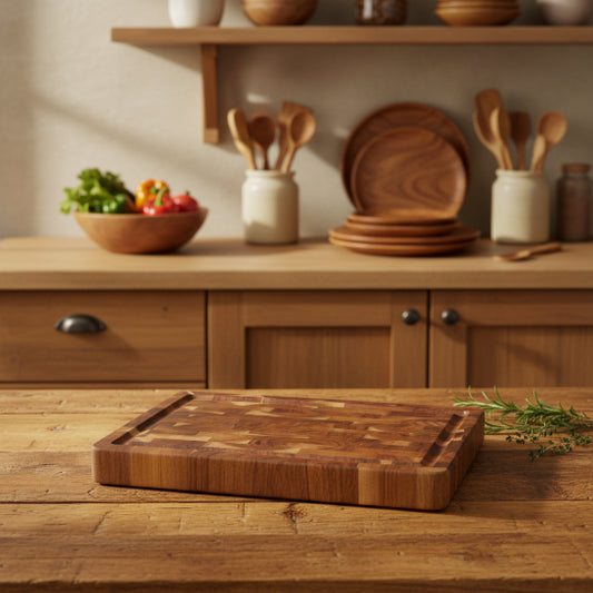 Notre planche à découper en acacia rainurée allie fonctionnalité et esthétique. Ses rainures permettent de récupérer les jus lors de la découpe de viandes ou de fruits juteux. L'acacia, bois dur et résistant, assure une longévité exceptionnelle à votre planche.