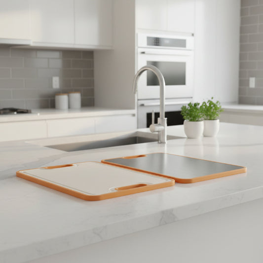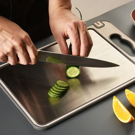 La planche inox se distingue par sa robustesse et son élégance discrète qui s'intègre dans toutes les cuisines. Son poids légèrement supérieur aux planches traditionnelles lui confère une stabilité appréciable pendant la découpe, surtout lors de la préparation d'aliments durs comme les courges ou les racines.